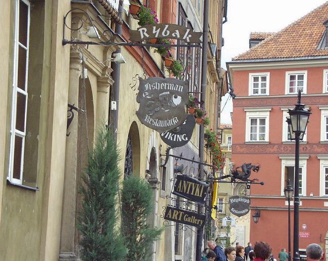 ヨーロッパに多い道に突き出た看板も面白い。VIKINGなどと書いてあるものもある。広場があって、青空マーケットが開かれているのもヨーロッパらしい。