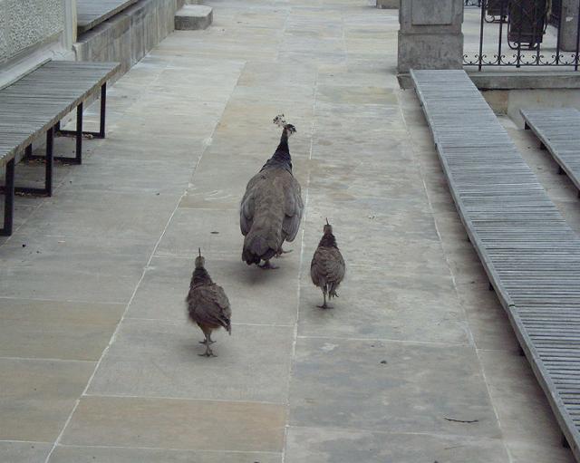 公園内を歩くと、クジャクがいる。リスがいる。ほかに白かったり、黒かったりするハトよりちょっと大きい鳥はなんだろう。これは、あとでカラスのたぐいとわかった。