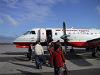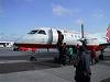 飛行機はSAABの双発プロペラの定員29名の小さなもの。座席は2列と1列の非対称。あれでも傾かないのかな。エンジンが回り出すと、はじめは良いが飛び出す頃から飛んでいる間中、機体全体がブルブルビリビリ。でも、昔、モスクワから羽田まで乗ったソ連製のターボプロップはひどかった。それに時間が長いかった。それに比べると今日のは物の数ではない。