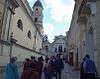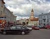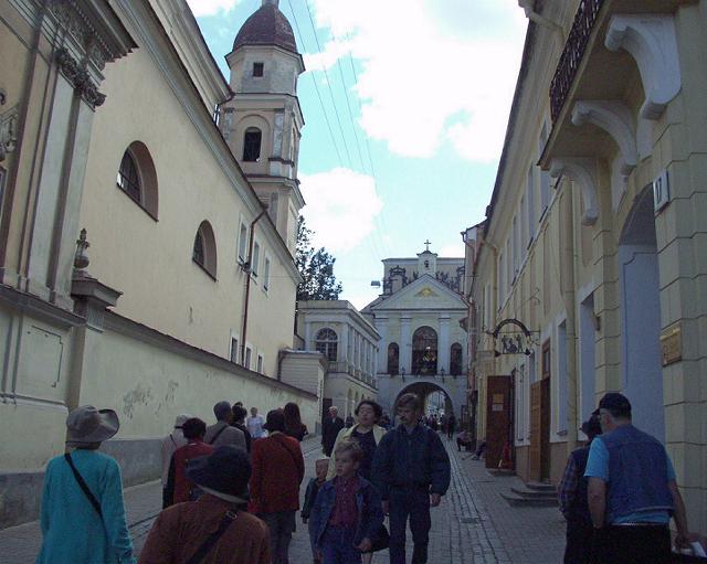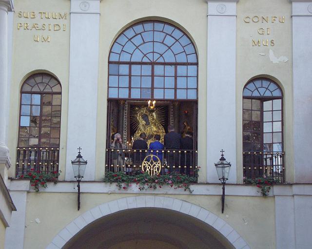 夜明けの門の上にある礼拝堂では、脇の階段から上がっていくと神父数名と敬虔な信者達がお祈りをしたり、賛美歌(と言うのかどうか)を歌ったり、一定の周期で行っている。そこへ、今上がってきた階段から信者達がひっきりなしに上がって行き、礼拝をし、降りて行く。われわれは、それを見物して来るだけ。なんとまあ。一応、厳粛な顔をして参列したあと、そっと出て来た。この礼拝堂は門の上だから、下を通る道から見上げると金ピカのマリアのイコンを見ることが出きる。下から一枚撮らせていただいた。