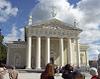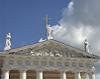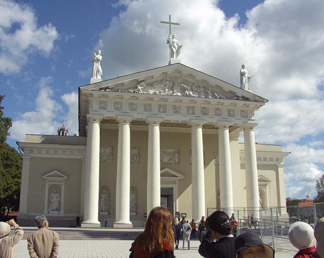そこから、少しバスに乗ってゲジミノ広場の大聖堂へ。ここはギリシャ、ローマ風の建物。ほかの教会とはちょっと異なった形をしている。前に円柱が6本。その上に三角の屋根が乗っていて、その三角の部分に何かの物語らしい彫刻がある。ゲジミノは14世紀にリトアニアに在位した国王の名前。建物はネオクラシック様式とガイドブックにはある。鐘楼が大聖堂の本体と離れて立っているのが変わっている。横に現代的なゲジミノ像。