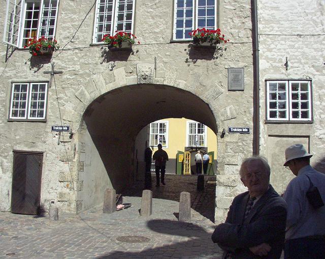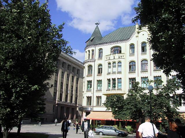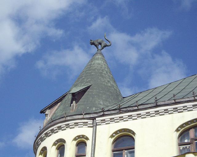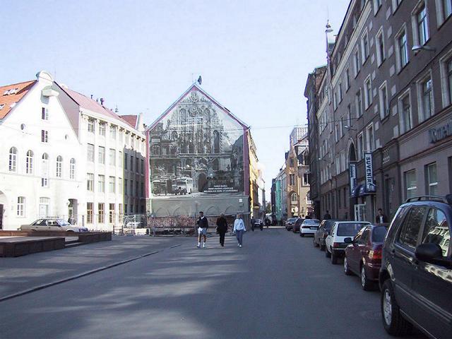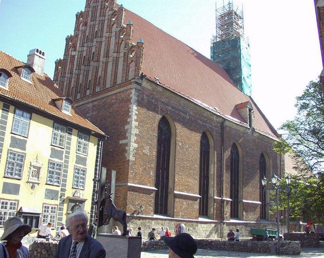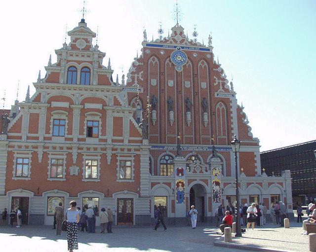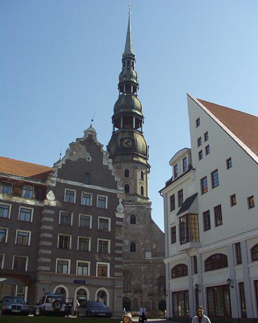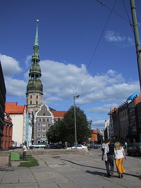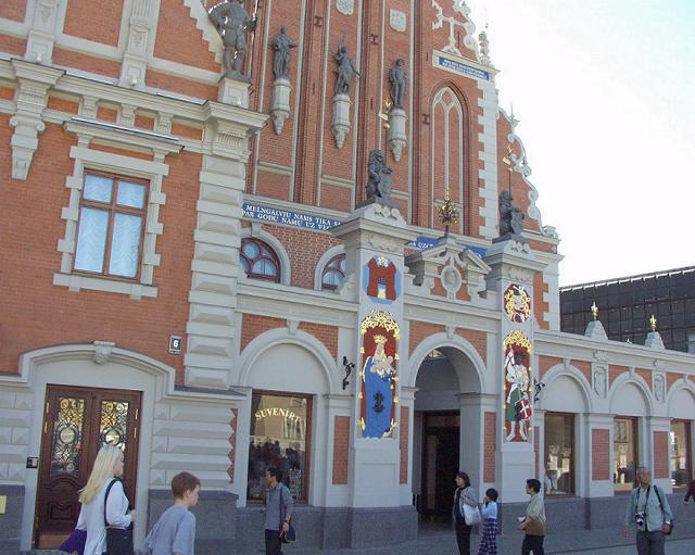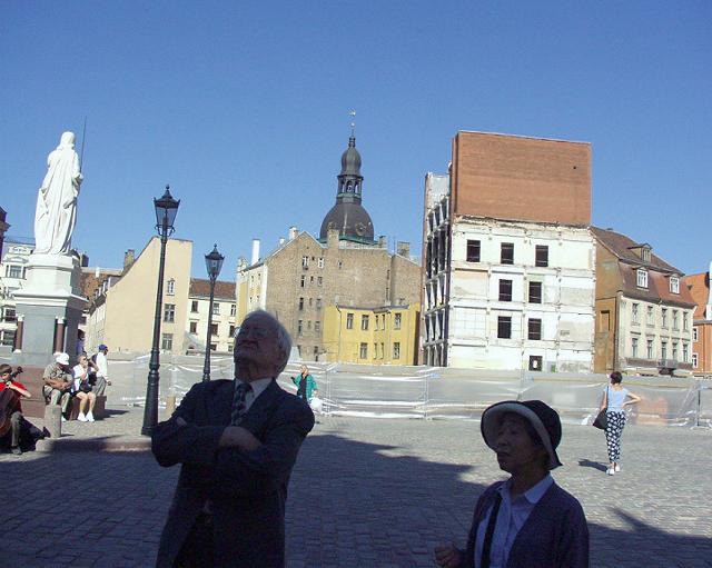 猫の家というのがあった。紀行文には「かってこの家には裕福なラトヴィア人が住んでいて、ビッグ・ギルド(商人の同盟)に入りたかったのですが、ラトヴィア人ということで断られ、その腹いせに猫の尻をビッグ・ギルドの建物の方に向けて取り付けたそうです。しかし、その後ビッグ・ギルドの建物が「交響楽団ホール」の建物となったため、猫に音楽を聴かせるため、頭をホールの方に向けたとのことです。」とあるが、私達が聞いたのは「お尻をむけて小便をかける形になっているのは穏やかでない、と裁判になって、結局、反対へ向けられた。」と言うことだった。すると、ガイドが違うのかな。