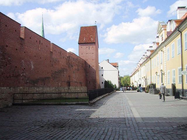 話を戻して、スウェーデン門は小さな門だが、1698年スウェーデン占領時代に作られた門で、市内に現存する唯一の城門だと言う。脇に鋳鉄の大砲の砲身が立ててあった。門を抜けて煉瓦の城壁に沿ってしばらく行くと火薬をしまっていたという煉瓦の塔。
