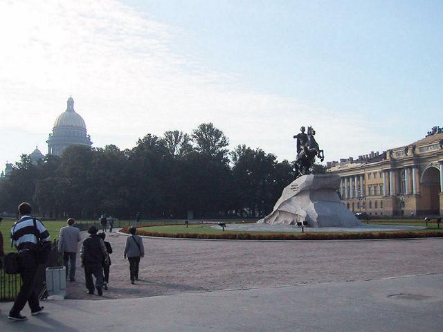 入館許可の時間の都合で、ショッピングの次はピョートル大帝像(青銅の騎士と呼ばれる)へ。後ろ足で悪の象徴大蛇(スエーデン)を踏みつけ、前足を高く上げた駿馬にまたがる大帝は、北方戦争での勝利を示していると言う。
