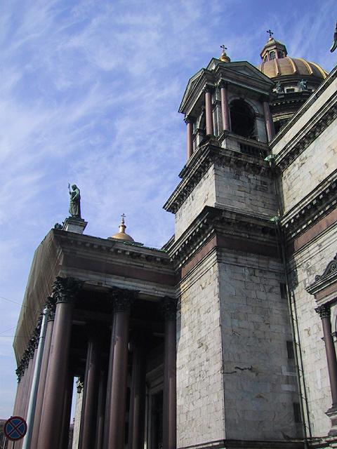 また、ぐるぐると回って大きなドームを持つ聖イサク寺院へ。内部は撮影禁止だったが、ラピスラズリを張りつけた青い柱を始めとする112本の花崗岩の柱、32種に及ぶカラフルな大理石の壁などなど、すごいの一語。でも、全く座るところがない。普通、教会にはベンチがあり腰掛けることが出来るのだが、ロシア正教では座ると言うことは許されないのだそうだ。皇帝も座るところがなく、柱の根元にちょっと高くなったところがあり、天蓋がしつらえられているだけ。函館のも、東京のニコライ堂も入ったことがないが同じようなのだろうか。