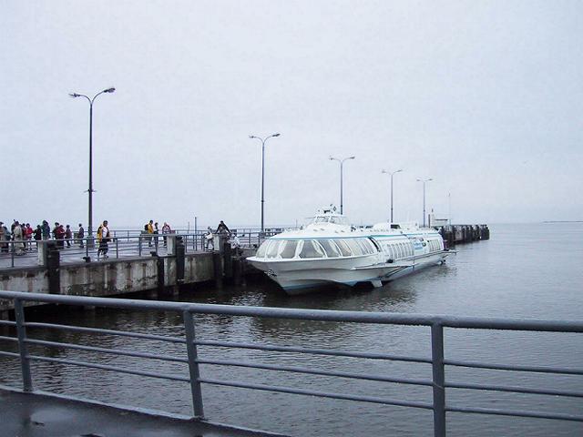 やっと着いて船に乗る。水中翼船で、サンクトペテルブルグの南西約29キロの船着場まで行くのだ。あいにくの雨だから、空は暗いし、窓は雨で濡れ、辺りは霞んでいる。折角のフィンランド湾の30分も散々なことになった。