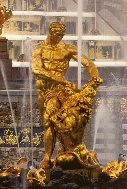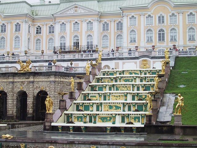 美しく作られた水路のほとりを歩いて宮殿の下まで行くと、サムソンの噴水とその宮殿側に作られた階段状の装飾的建造物が目に入る。なんときらびやかなことか。