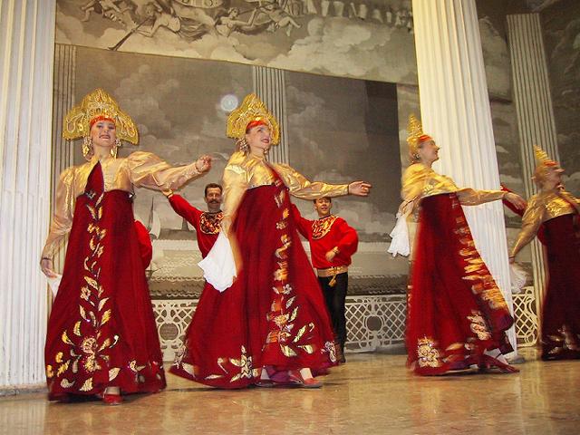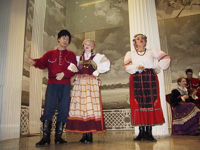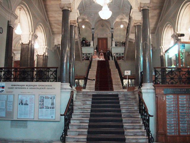 午後5時半、予約していた三人と、今夜だけの若い青年ガイドとタクシーでロシア舞踊と音楽を聴きに行く。それは、近くのニコラエフスキー宮殿だった。玄関を入ると、まっすぐに階段が四階くらいまで続いている。6時の開場を待っていると、階段の上の方に中世のコスチュームの女性が二人現れた。これもワン・ショット 1ドルだ。