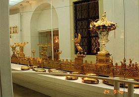 ようやく宮殿見学の入り口を見つけて入る。始めの部屋は宮殿の食器の展示室だった。金ピカの食器がズラリ。そして、きれいにいろんな絵の描かれた陶磁器がズラリ。どれも、実際に使ったら傷がついたり、色が剥げたりで大変だろうと思うのが先に立ち、また、豪華さに圧倒されてばかりいた。一番中庭に近い部屋に「アーティフィシャル・フッズ」と書いてある。一体何か?入って見ると、なんとそこには日本の食堂のショウウィンドウと同じ物が並んでいるではないか。ビールが入ったジョッキから、天丼セット、寿司の盛り合わせ、おせち、会席料理、などなど。同じ展示するならもう少し出来のいいものを並べて欲しかった。日本人の目で見るとどうしてもちゃちなのだ。一体こんな物を並べるなんてどう言う趣旨なのだろう。結構大きな部屋を使ってあんな物を紹介するとは。珍しいからだろうか。芸術や美術とは違うような気がするけれど。