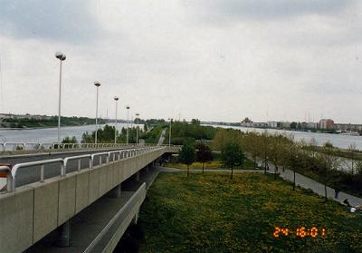 ドナウは見えないことがわかった。では、と言うことで、ドナウを積極的に見に行くことにした。地下鉄U1で三つ東北に行くとドナウ川と新ドナウ川との間の中島(と言っても、手もとの地図では上から下まで続いているから、ドナウ川と平行に新ドナウ川を作るときに残した部分なのだろう。)にあるドナウインゼルと言う駅に降りる。ここなら両方を見ることが出来るはず。