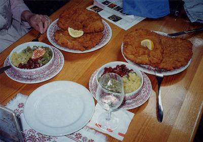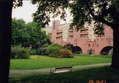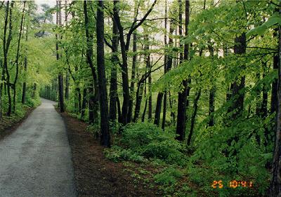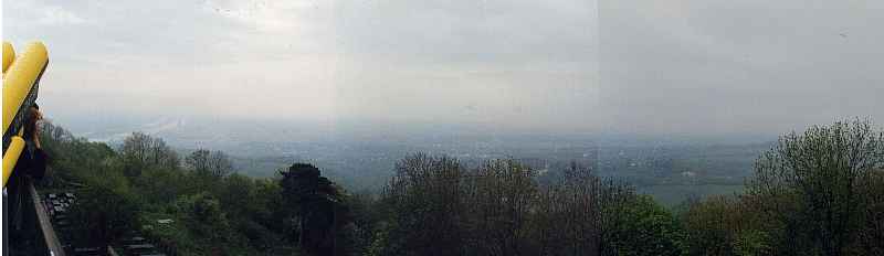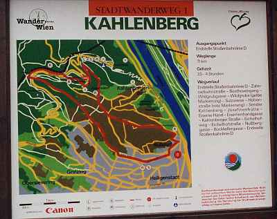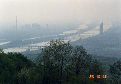 | ドナウ川と新ドナウ川 | この地図の右下、赤マーク辺りからバスで山頂(上から1/4、左から1/3 くらいのところ)へ登り、そこからちょっと上へ、そして白いくねくねした道を 右のドナウ川まで歩いた。 |